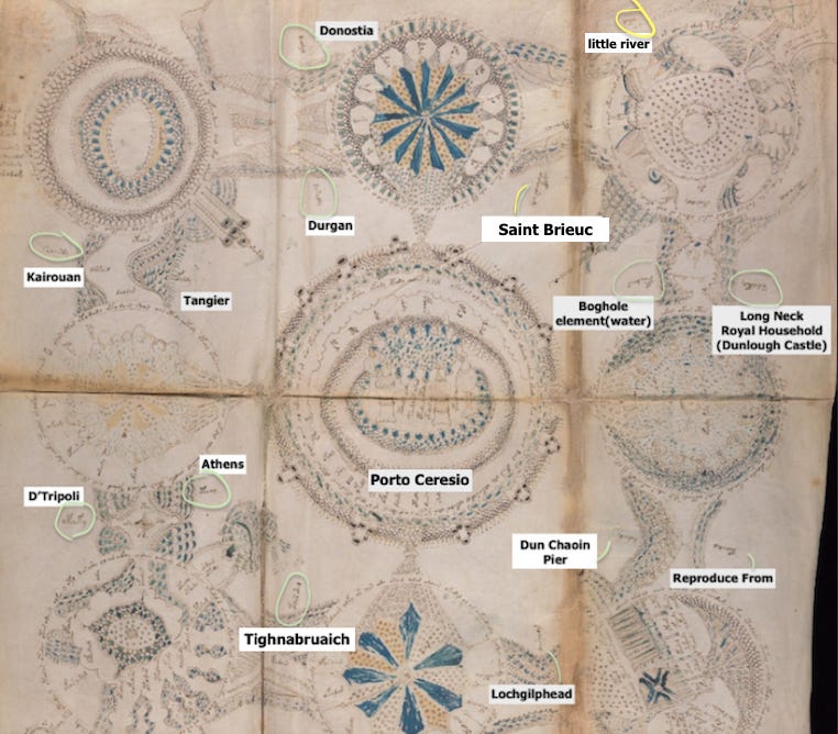 Saint Brieuc was corrected from the last map and abhadhin, or little river, written very slightly and small in the top right, meaning small river (abha dhin) is likely referring to La Méaugon the small river and commune behind Saint Brieuc.