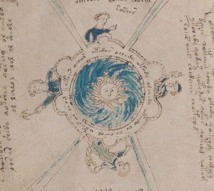 The theme of filtering repeats here as well. As we see in the Alkali cycle and several points in the natal sections, description of filtering. Like the processes depicted and explained, the language has also gone through some kind of filtering. A reduction and condensation. A linguistic resin or medicine, so to speak. Here in the center of these four individuals, we have a drain, with Ogham ebbing, leaving behind only “what is needed”(73v)